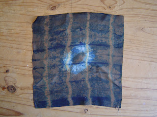Shibori techniques using a darker dye recipe. Other techniques were also applied such as painted fabric and application of dye with a rubber stamp providing variety and interest. Different effects were achieved with painting the dye on fabric using a brush or immersing the fabric in a dye bath and allowing to fix for 90 minutes.